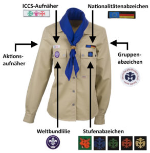 Zur Grundausstattung jedes Pfadfinders gehört das Klufthemd, ein Halstuch in der jeweiligen Stufenfarbe und verschiedene Aufnäher für das Hemd.